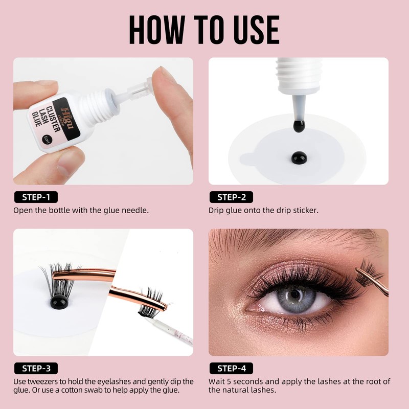 - EASY TO USE: Step 1: Open the bottle with the lash glue needle. Step 2: Drip glue onto the drip sticker. Step 3:Use tweezers to hold the eyelashesand gently dip the glue. Or use acotton swab to help apply the glue. Step 4: Wait 5 seconds,when the lash glue is half dry, apply the lash clusters at the root of the natural lashes.
