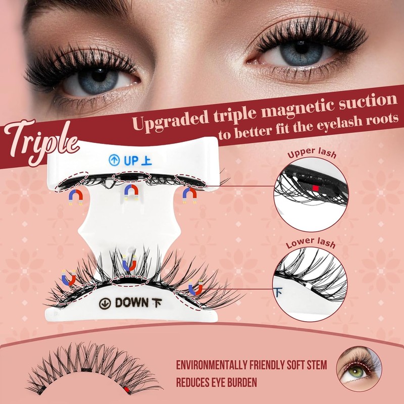 Higu Clace Magnetic Eyelashes Kit – Includes 2 pairs of natural-looking magnetic lashes, a lash applicator, and an instruction manual, all in a compact mirror box with a magnetic base. No glue, eyeliner, or mascara needed—perfect for sensitive eyes. Each lash has 3 strong magnets for a secure, comfortable hold. Beginner-friendly and easy to apply in seconds, these reusable lashes are eco-friendly and great for travel or daily use. Questions? Our customer service is always here to help!