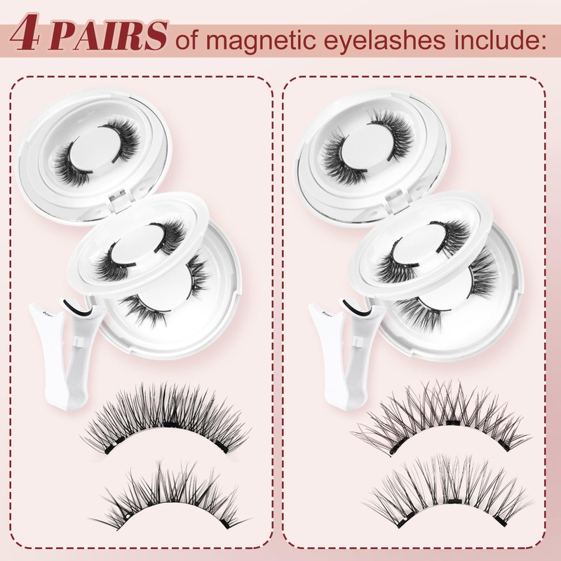 - MAGNETIC EYELASH KIT: The magnetic eyelash kit includes 4 pairs of magnetic eyelashes, 2 magnetic applicators, 2 small magnetic box with mirror and one instruction sheet.Magnetic eyelashes are easy to operate and only take 1 minute to complete, effectively saving your makeup time and allowing you to stayed on through an entire sweaty rave!