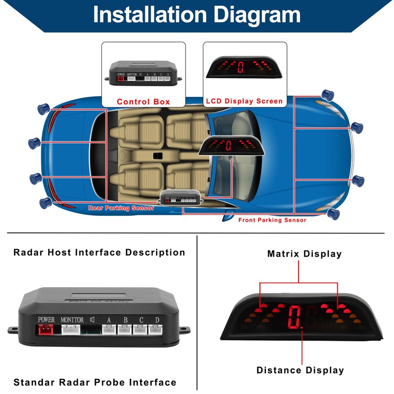 - What You Get:This parking sensor system includes 2 precision sensors, a control box, and a LED display screen.