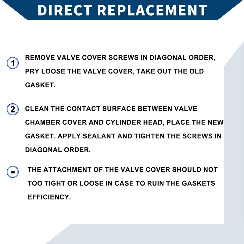 - Installation instructions: 1. Loosen the valve cover screws in diagonal order and pry off the valve cover, take out the old valve cover gasket. 2. Clean the contact surface between valve chamber cover and cylinder head, insert the new valve chamber cover gasket, apply sealant and tighten the screws in diagonal order. Note that the attachment of the valve cover should not be too tight or too loose.