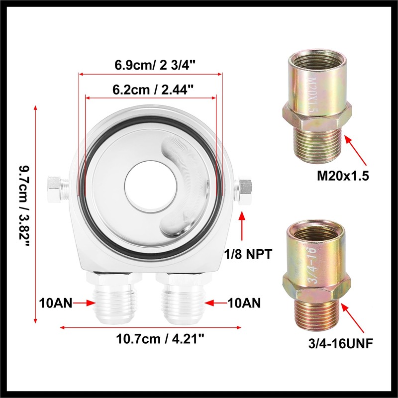 - Convenient: Specification: Material: Aluminum Alloy , Color: Silver Tone, Dimension: 10.7x9.7x3.3cm / 4.21"x3.82"x1.30"(L*W*H), Adapter Thread Size: 3/4-16UNF, M20x1.5, Screw Thread Size: 1/8 NPT, Inlet Diameter: 10AN , Outlet Diameter: 10AN
