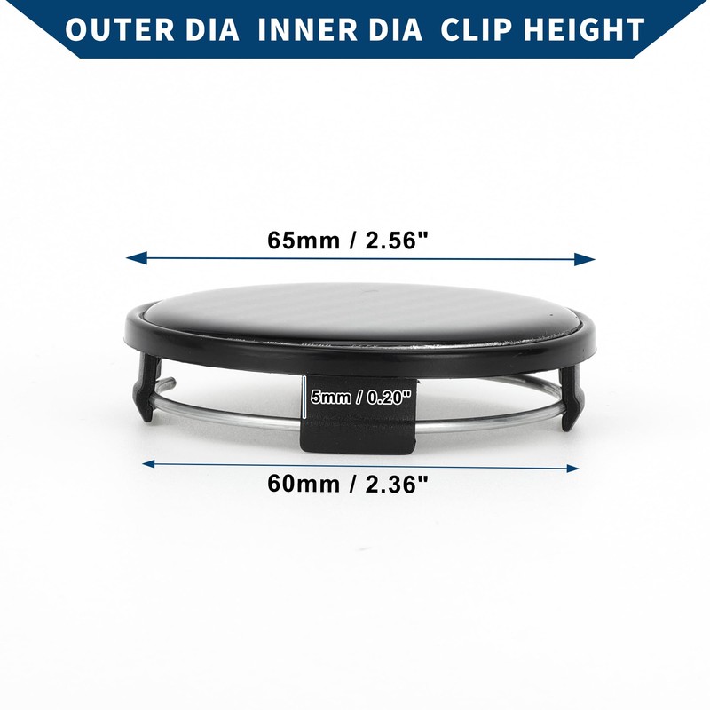 These universal car wheel hub center caps feature a precise fit with a outer diameter of 65mm / 2.56"(OD), Inner Diameter of 60mm / 2.36"(ID) and clip height of 11mm / 0.43"(H) designed to match various common car wheel specifications. They are engineered to provide a snug and secure attachment to the wheel hub.