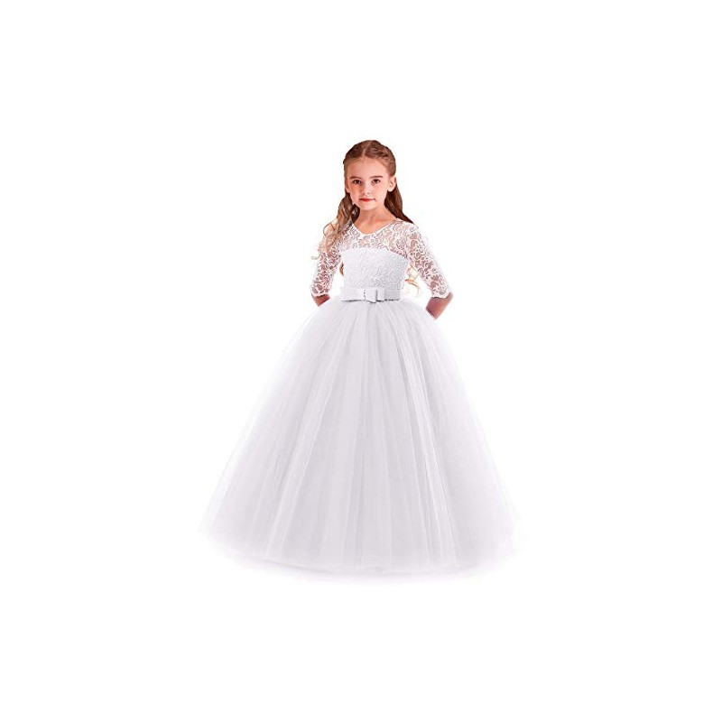 HIHCBF Flower Girls 3/4 Sleeves Lace Tulle A-Line Dress Floor Length Pageant Party Wedding Maxi Evening Dance Prom Ball Gown White 9-10T