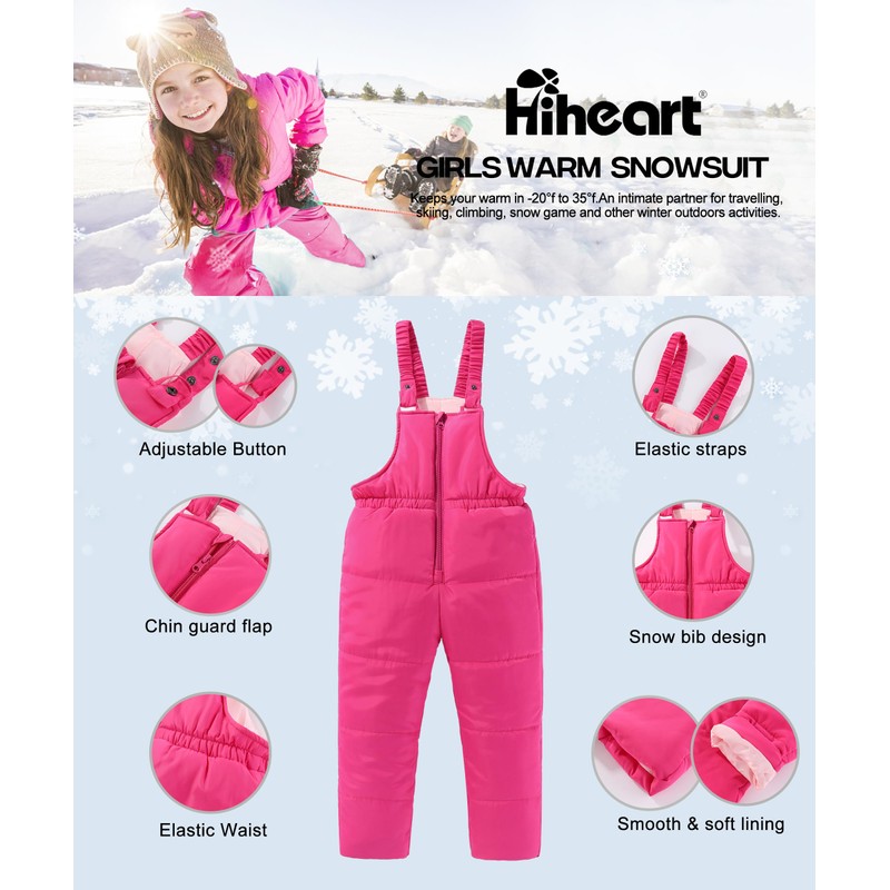 - The snow pants have elastic shoulder straps flex to movement and adjust for a fine-tuned fit even as your kid grows.