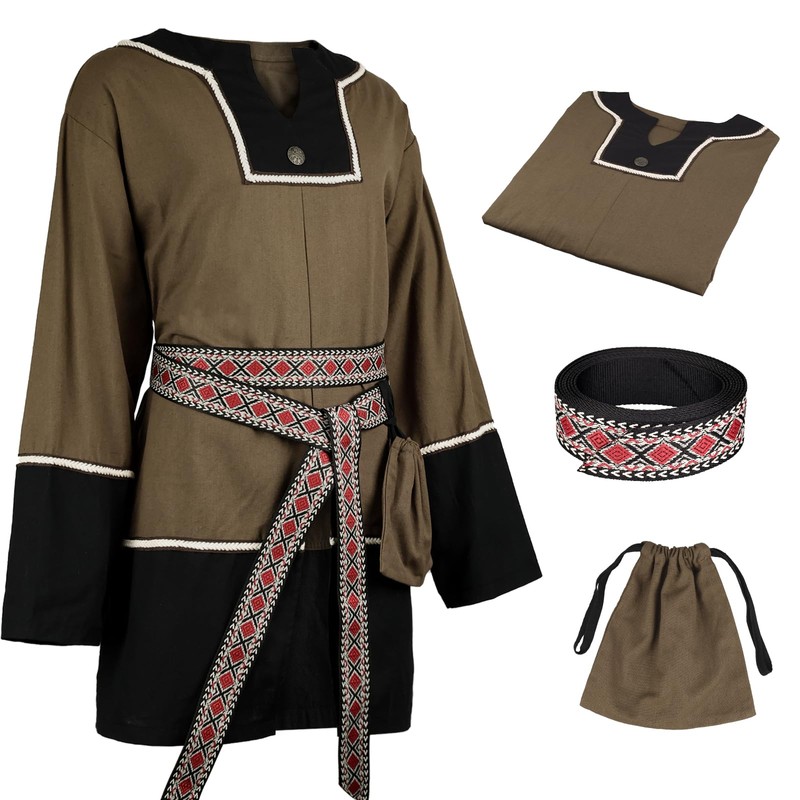 - COMPLETE SET- Including a top, belt, and pouch—no need to worry about matching. The top has a loose, comfortable fit for various body types; the woven belt combines decoration and utility (adjustable + pouch - hanging); the drawstring bag holds small props (coins, runestones). One set completes your character look.