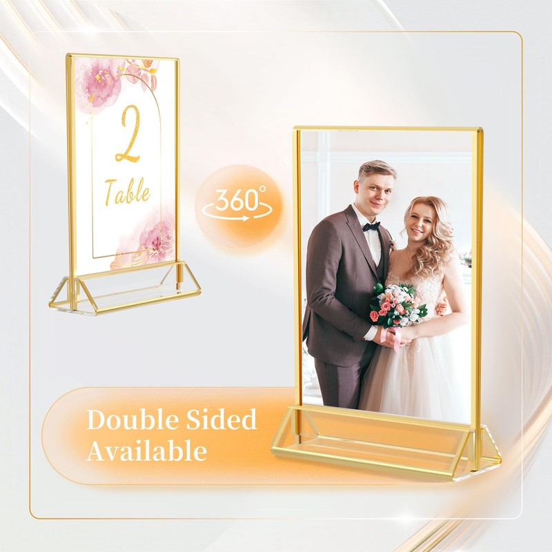 - ELEGANT & STYLISH: You can display two photos back to back, or hold a table number card on the wedding tables. The 4mm thick gold border frames made of crystal clear acrylic which is much transparent than others’ products, they will incorporate your wedding theme and act as an important piece of decor.