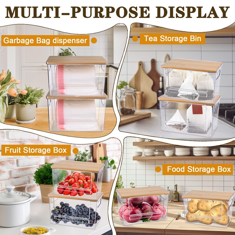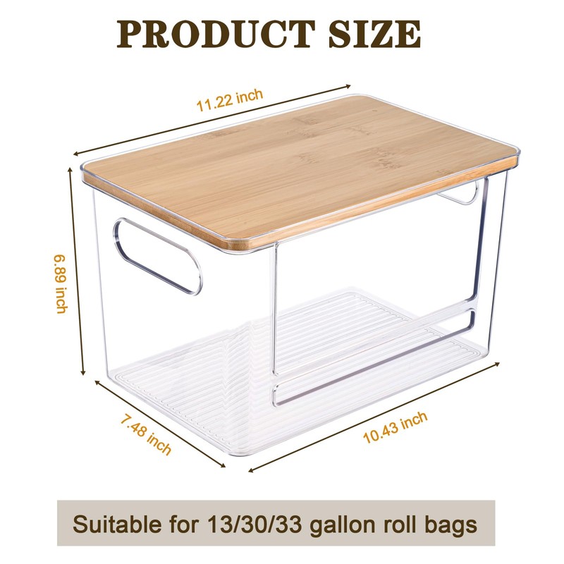 - HIGH-QUALITY MATERIALS: The kitchen trash bag dispenser is made of thick clear plastic and natural bamboo wood, durable and well-made, with super smooth edges and a unique design to enhance your lifestyle. The clear design gives you the best view of the contents so that you can easily see the trash bag and refill it at any time