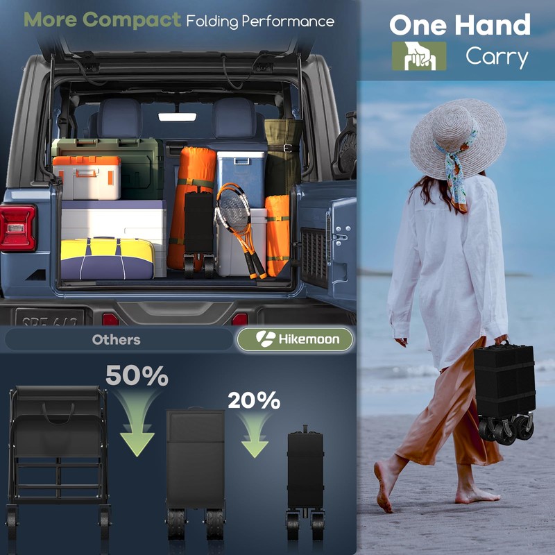 Hikemoon 150L Collapsible Wagon – Heavy-Duty Folding Utility Cart This foldable wagon features a 150L large capacity (50% bigger than standard carts) with a side pocket and cup holders for extra storage. Quick setup & compact fold design reduces it to 1/6 its size for easy storage. The auto-rebound handle adjusts effortlessly, while 7" all-terrain wheels handle sand, grass, and rough terrain smoothly. Built with a sturdy metal frame (360LBS capacity) and 600D Oxford fabric, it’s durable, waterproof, and easy to clean. Ideal for beach trips, camping, groceries, gardening, and sports gear, this heavy-duty wagon makes transport easy. Foldable, portable, and built to last.
