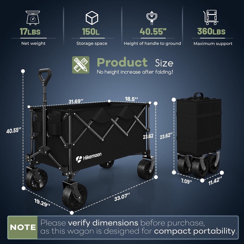 - 【𝟐𝟒-𝐇𝐨𝐮𝐫 𝐑𝐞𝐬𝐩𝐨𝐧𝐬𝐞 & 𝟏𝟐-𝐌𝐨𝐧𝐭𝐡 𝐖𝐚𝐫𝐫𝐚𝐧𝐭𝐲】: Hikemoon foldable wagons come with a 𝟏-𝐲𝐞𝐚𝐫 𝐰𝐚𝐫𝐫𝐚𝐧𝐭𝐲. Please feel free to contact us if there is any question about the collapsible utility wagon. We'll get back to you within 24 hours.