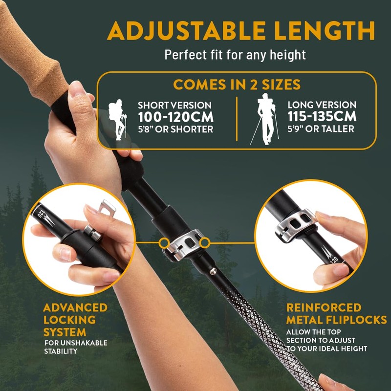 - Ultimate Adjustability - Our collapsible hiking poles offer two adjustable sizes: 100cm to 120cm for those 5'8" and under, and 115cm to 135cm for those 5'9" and taller. These folding walking sticks for hiking adjust easily to any height.