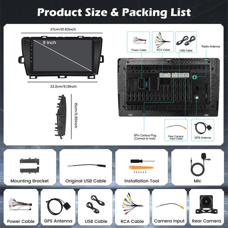 - 【9 Inch Large Screen Multifunction Car Stereo】for toyota prius android radio support GPS Navigation/WiFi/Hotspot/Bluetooth/Hands-free Calling/Split Screen/Mirror Link(except Huawei&Samsung)/Steering Wheel Control/FM RDS Radio/Video Out, with AHD Backup Camera, Microphone