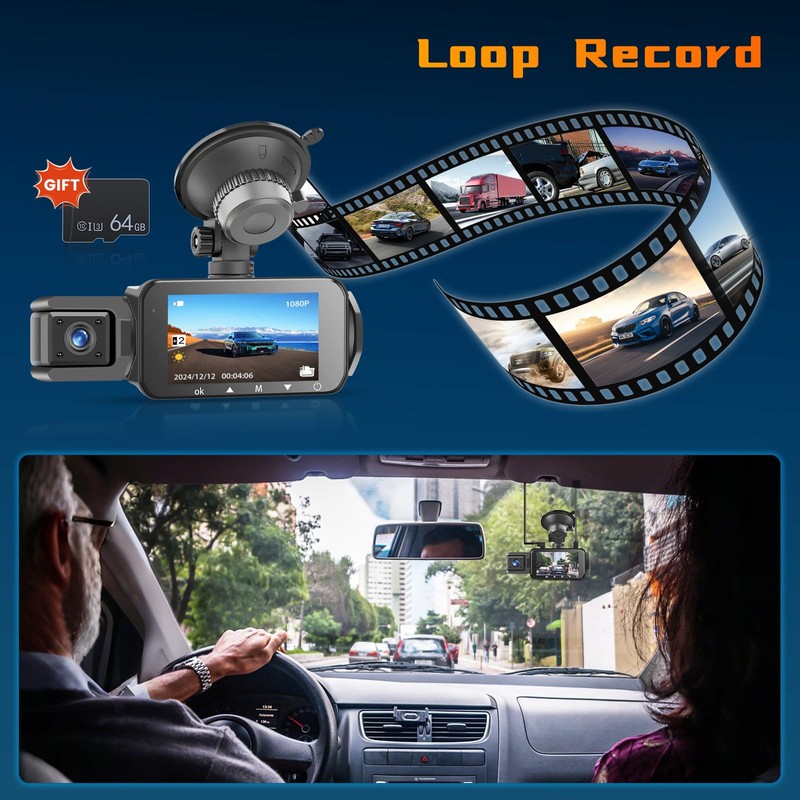 - 【Loop Recording, G-sensor】The quadruple channel dashcam provided 64G card supports loop recording. When it's full, it can automatically overwrite the old video. G-sensor can be triggered when detecting emergency braking or collision and lock the current video file immediately, which will not be overwritten