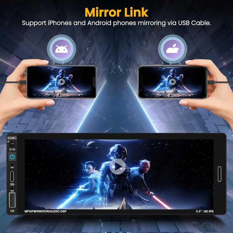 - Bluetooth 5.0 and Mirror Link: The carplay radio equipped with Bluetooth system and enables a superior music listening experience!Bluetooth car stereo support Mirror Link, it can be synchronized to the car screen through the USB cable, the car radio will display the content from your cell phone screen synchronously such as maps, movies, games
