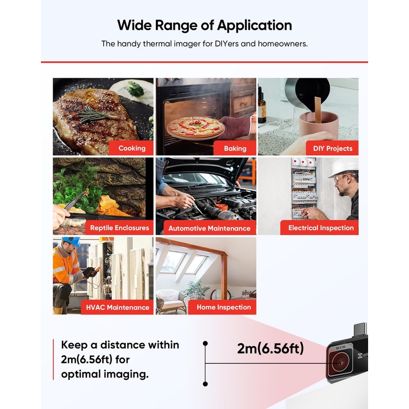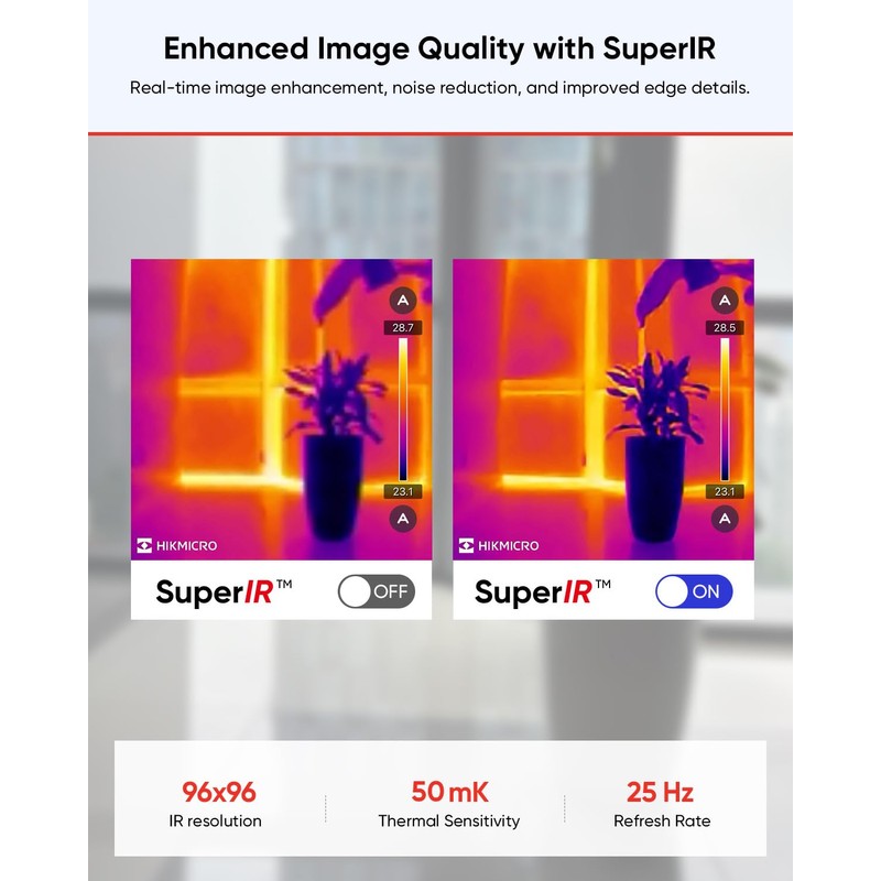 - Visualize Heat Patterns, Enhanced Image QualityThe MiniE thermal camera is designed for DIYers and homeowners. It allows you to visualize heat patterns and measure temperatures at 9,216 points, eliminating guesswork. The camera offers 96x96 IR resolution and is equipped with advanced SuperIR image enhancement technology for real-time image enhancement, noise reduction, and improved edge details. It provides a smooth view at 25Hz and allows adjustments for sharpness, contrast, brightness, etc.