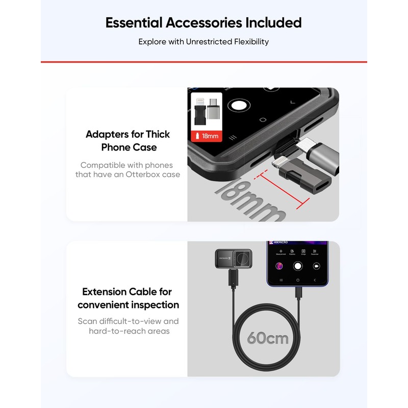 - Portable & Easy to UseWeighing only 0.71 ounces (20 g), the MiniE thermal camera is compact and lightweight. It's plug-and-play with all your smartphone or tablet (Android and iOS), ready to use in seconds. The auto-rotation function syncs the screen with the shot direction, while the manual "90" rotation and extension cable allow for flexible inspection. The package includes a 23.6"(60cm) extension cable, EVA storage bag, quick guide, and USB extension adapter for convenience.