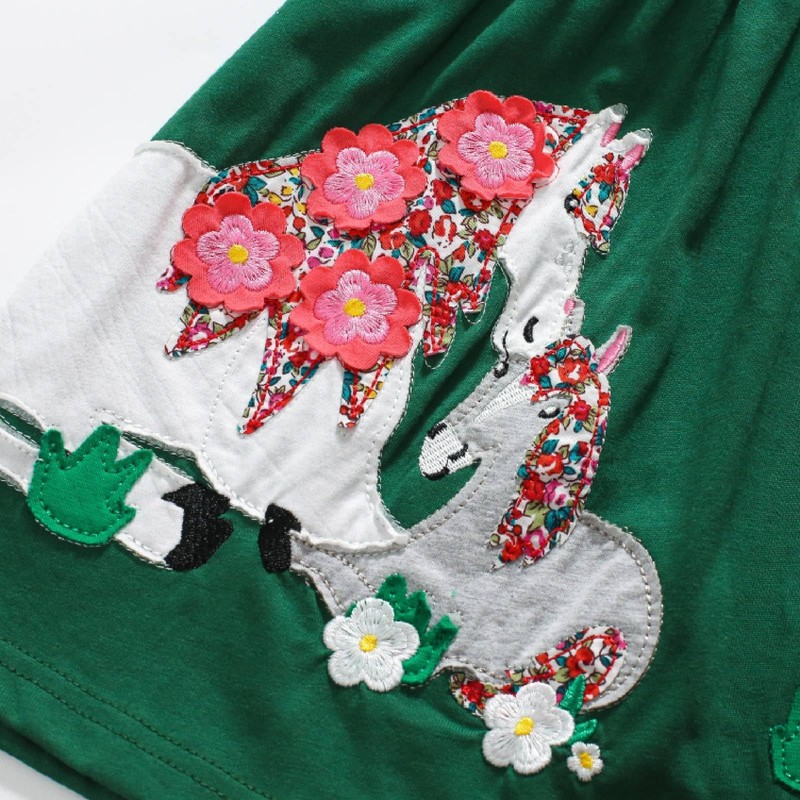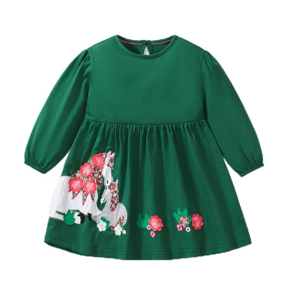 HILEELANG Toddler Girls Long Sleeve Dress Cotton Casual Christmas Green Unicorn Applique Playwear Party Dresses 4T