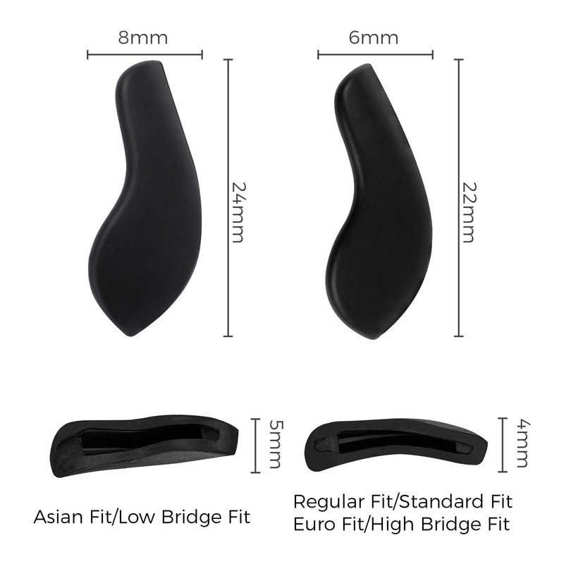 - [Package Includes]: 1 Pair of Standard Fit/Regular Fit/High Bridge Fit/Euro Fit nosepads, 1 pair of Asian fit/Low Bridge Fit nosepads.