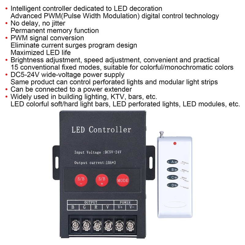- STABLE PERFORMANCE: RGB controller is an intelligent controller dedicated to LED decoration, using the current advanced PWM(Pulse Width Modulation) digital control technology.