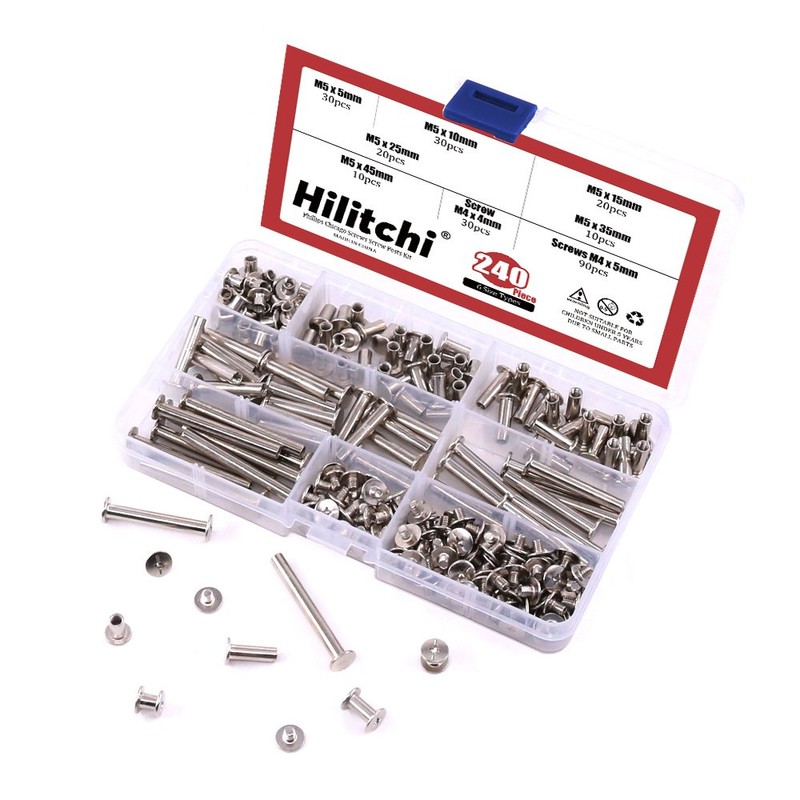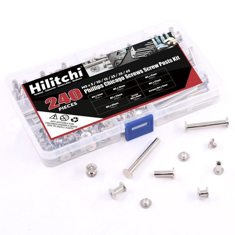 Hilitchi 240-Pcs(120 Pair) M5 x 5 / 10 / 15 / 25 / 35 / 45 Phillips Chicago Binding Screws Scrapbook Photo Albums Binding Screws Screw Post Extenders Assortment Kit
