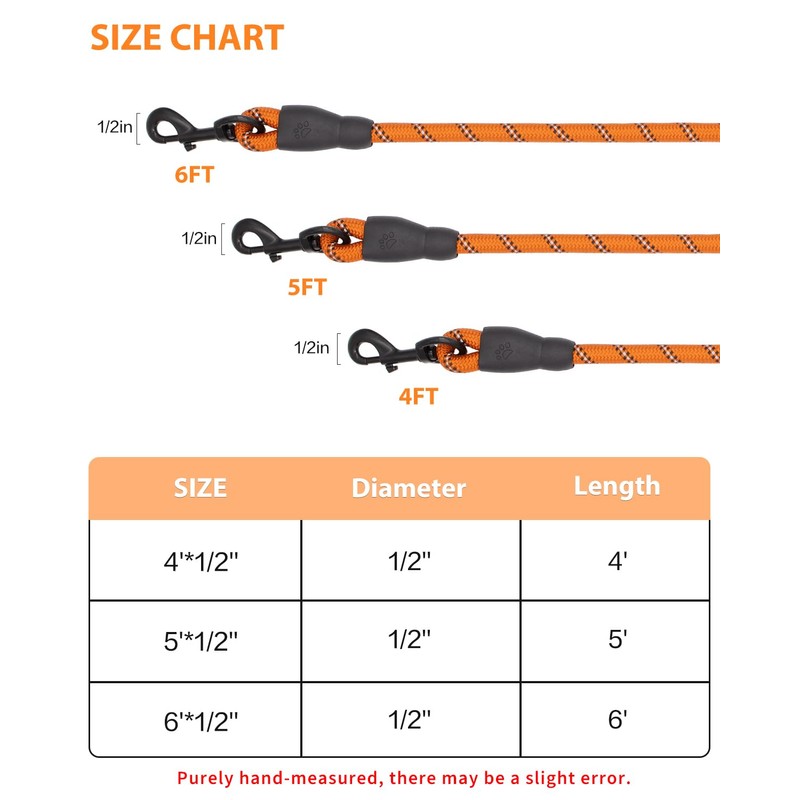 Hilkycton Heavy Duty Dog Leash, 4/5/6FT Reflective Rope Dog Leash with Soft Padded Handle, Strong Dog Leash for Small Medium Large Breed Dogs with Poop Bag Holder, Orange, 5'*1/2''