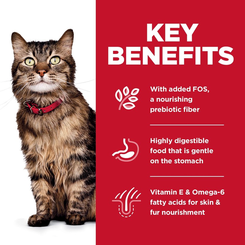 Your cat's stomach health is a vital part of his or her everyday life, which is why Hill's Science Diet Sensitive Stomach & Skin dry cat food provides optimal digestive health while nourishing skin & promoting a lustrous fur. Using prebiotic fiber, this dry food fuels your adult cat's beneficial gut bacteria, helping support a balanced microbiome for lifelong health. The easy- to-digest ingredients allow your feline friend's stomach to process nutrients quickly – a process that allows for easier stool pickup as well. Finally, this cat food made with natural ingredients provides vitamin E and omega-6s to nourish your grown cat's skin and support a healthy fur coat. There’s more to love with the new look of Science Diet. Some of our products also have new names, new kibble shapes & new formulas. Hill’s Pet Nutrition’s Mission: To help enrich and lengthen the special relationships between people and their pets. More than 220 veterinarians, food scientists, technicians and Ph.D. nutritionists at Hill's develop all of Hill's pet foods to meet the needs of your pets. Hill’s only accepts ingredients from suppliers whose facilities meet stringent quality standards and who are approved by Hill's. Not only is each ingredient examined to ensure its safety, we also analyze each product's ingredient profile for essential nutrients to ensure your pet gets the stringent, precise formulation they need. Hill’s uses only high-quality ingredients including real chicken, lamb or salmon protein. Hill’s dry pet foods have quality protein as the first ingredient and provide clinically proven antioxidant benefits. Plus, they’re made with natural ingredients (plus vitamins, minerals & amino acids) and never contain artificial colors, flavors, preservatives or chicken by-product meal. Hill’s food, shelter & love program donates food to shelters across the country, providing the proper nutrition that helps pets find their way to loving homes. With every purchase of Science Diet you help feed over 100,000 homeless pets every day, 365 days a year.