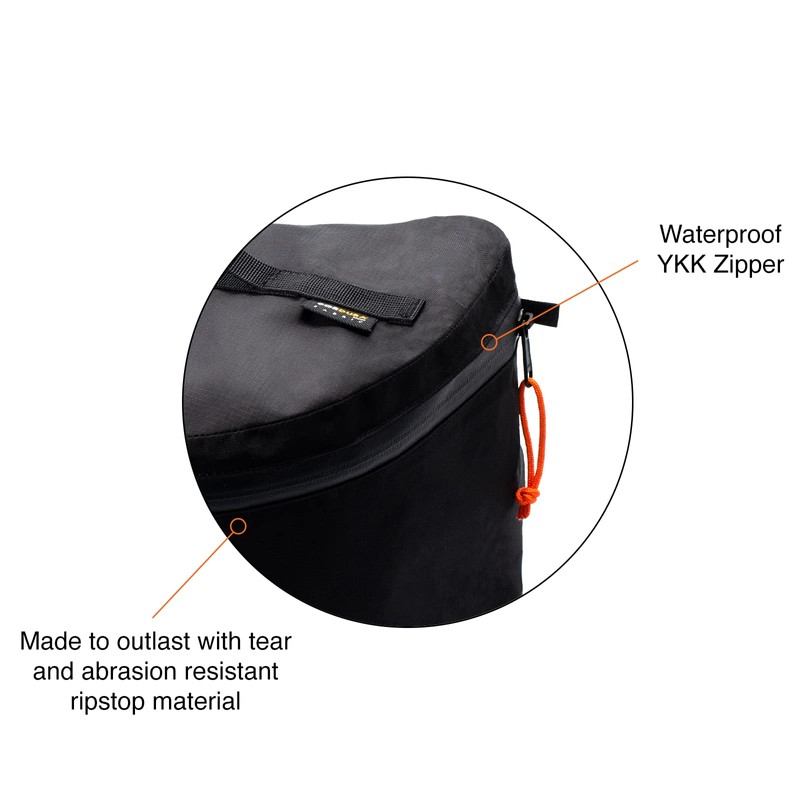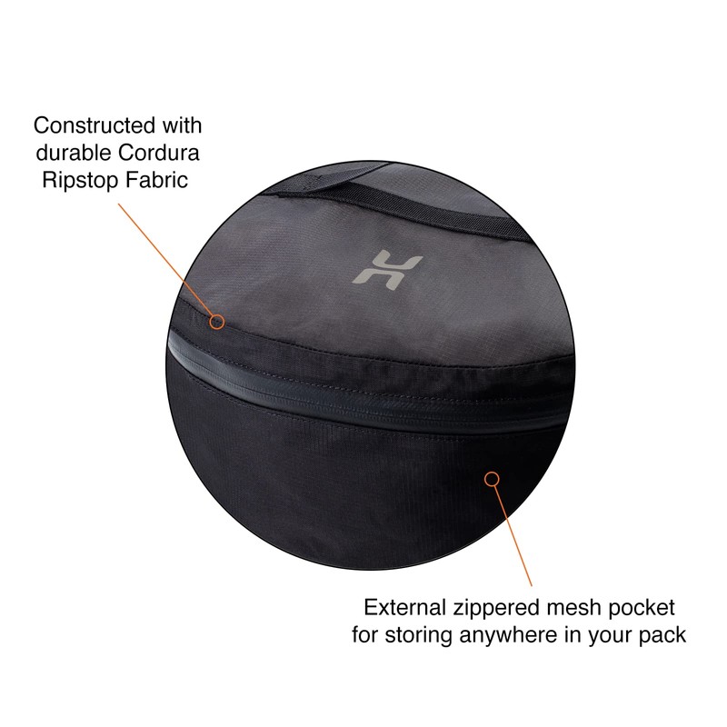 丈夫なリップストップ防水素材(CORDURAリップスットプナイロン)/フルシーム加工済/YKK止水ジッパー/軽量、コンパクト/小物入れにも使える収納できるメッシュケース付/持ちやすいトップハンドル/背面部分はハイドレーションのスペースを考慮した三日月形(パック内のデッドスペースをなくします。)/開けやすい長めのジッパータブ