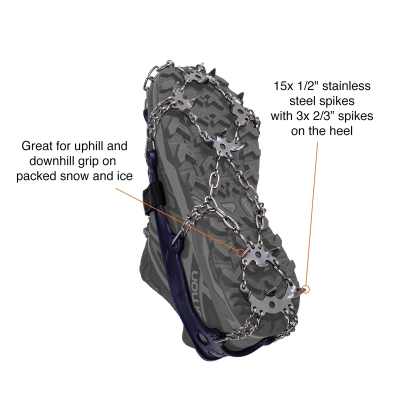 - TRACTION & COMFORT: 18 carbon steel 13mm and 15mm spikes combined with a hinged front plate system allow for unrivaled flexibility and secure strides on steep uphill and downhill trails covered in snow and ice.