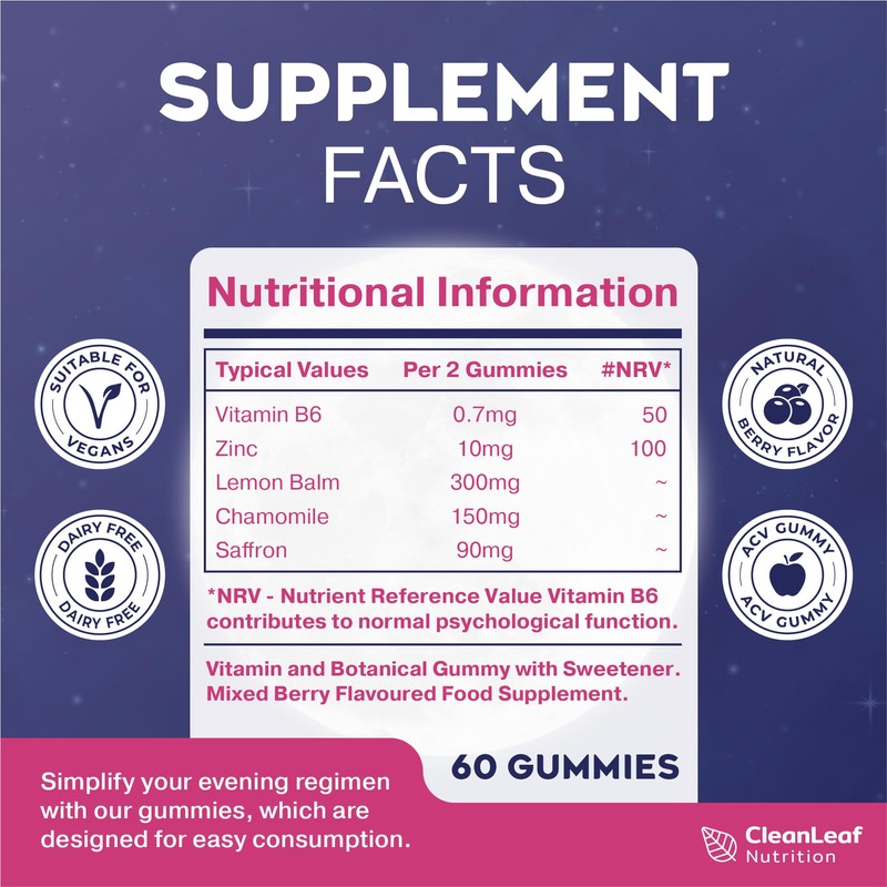 Product descriptionIntroducing Unwind Sleep Support Gummies – the perfect addition to your nightly routine, designed to blend effortlessly into your lifestyle while offering a delightful taste experience. Each gummy is infused with a luscious mixed berry flavor, capturing the essence of nature in every bite. These delectable gummies are not just a treat for your taste buds but also a consistent and reliable part of your evening regimen.Crafted with meticulous care, every gummy in your pack ensures uniformity in both taste and quality. We understand the importance of consistency in your health supplements, which is why each gummy, from the first to the last in the bottle, offers the same satisfying experience.Our easy-to-integrate serving size is specifically designed for convenience. With just two gummies per day, you get the perfect dosage in a neatly packaged 30-day supply bottle. This straightforward approach makes Unwind Sleep Support Gummies an uncomplicated yet integral part of your daily routine.At Hillten Health, we are committed to quality. Our gummies are formulated with select, high-quality ingredients, ensuring that you're not just enjoying a delightful treat, but also a product you can trust. We focus on the purity and efficacy of our gummies, so you can feel confident about incorporating them into your nightly routine.We also place great importance on our packaging. Our Unwind Sleep Support gummies come in a user-friendly, secure container designed to preserve their freshness and potency. The practical and appealing design ensures that your gummies remain protected and effective throughout their shelf life.Choose Our Gummies for a harmonious blend of taste, quality, and convenience. Make them a part of your night, and look forward to a delightful, consistent, and quality experience every time.IngredientsSpecial Melotonic-Blend Including Saffron Lemon Balm Extract 45mg, Chamomile Extract 5mg, L-Theanine 30mg, Vitamin E, Vitamin B6, Blackcurrant Juice Powder, Pectin, Acidity Regulators (Citric Acid, Sodium Citrate, Malic Acid), Lemon Balm Extract, L-Theanine, Vitamin E (D-Alpha Tocopheryl), Natural Mixed Berry Flavouring, Anthocyanins, Chamomile Extract, Glazing Agents (Vegetable Oil, Carnauba Wax), Vitamin B6 (Pyridoxine Hydrochloride), Sweetener (Steviol Glycosides).