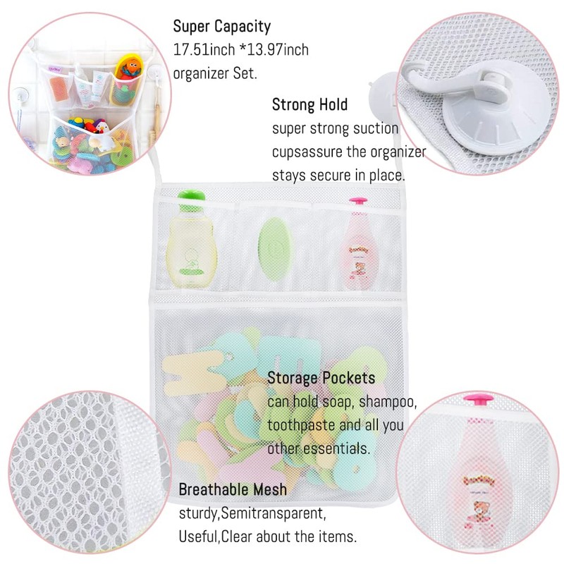 - 4. Multifunctional: The bath toy bag is perfect for storing small children's toys and everyday items such as shampoo, lotion, toothpaste, brushes, sponges and drinkers for a tidy bathroom.
