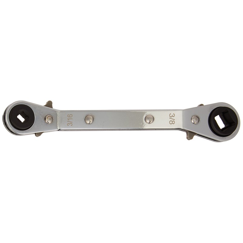 This HVAC service wrench includes smart features that save your knuckles and your time. The offset HVAC wrench makes navigating hard to reach areas second nature. The reversible wrench has square openings of 1/4 in by 3/16 inches on one end, and 3/8 in by 5/16 in on the other end. The included Hex Key adapter works with liquid and suction based valves. Compativle with 3/16" and 5/" hex valves.