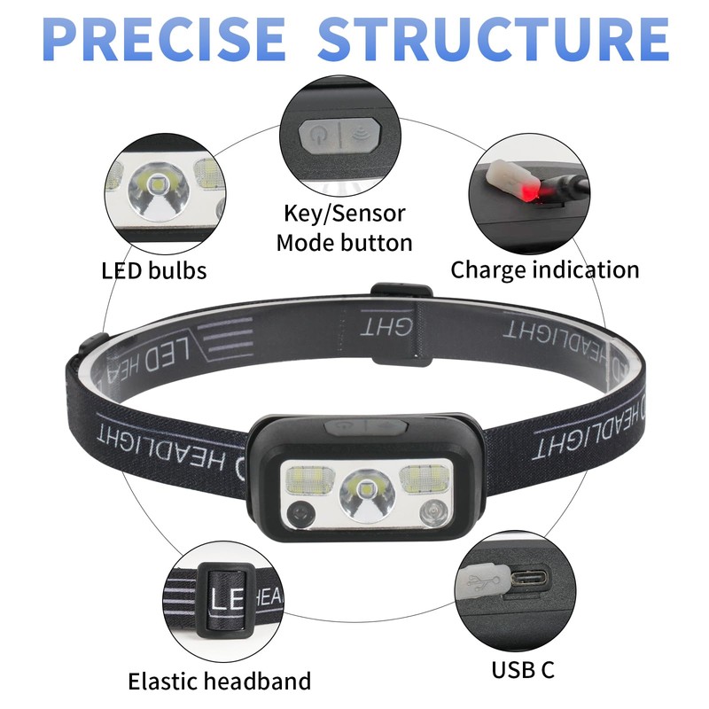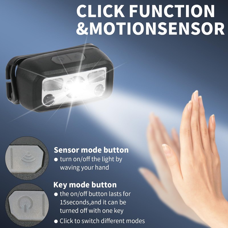 - 8 Modes: The led headlamp has 8 lighting modes to meet your various needs. ( 1 ) In key light mode, you can switch the main strong beam, main weak beam, side strong beam, side weak beam, red beam, red strobe. ( 2 ) In motion sensor mode, you can switch the main strong beam and side strong beam.