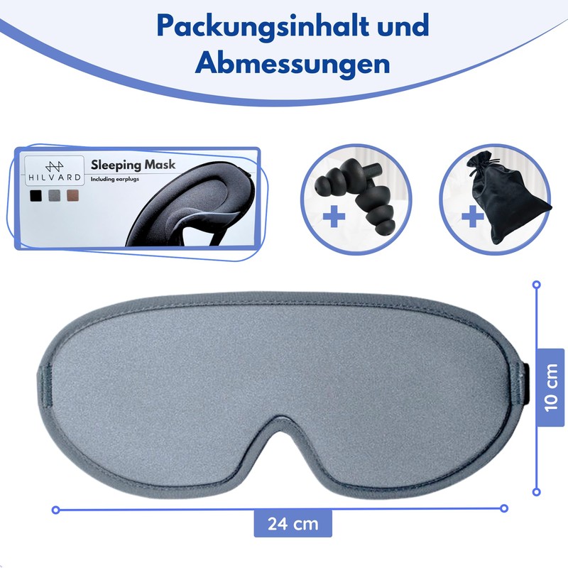 Hilvard Schlafmaske, Augenmask, inklusive Schlaf-Ohrstöpsel, 100% Verdunkelung, verstellbar, ergonomisch, Grau