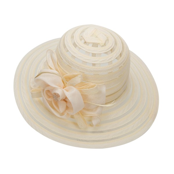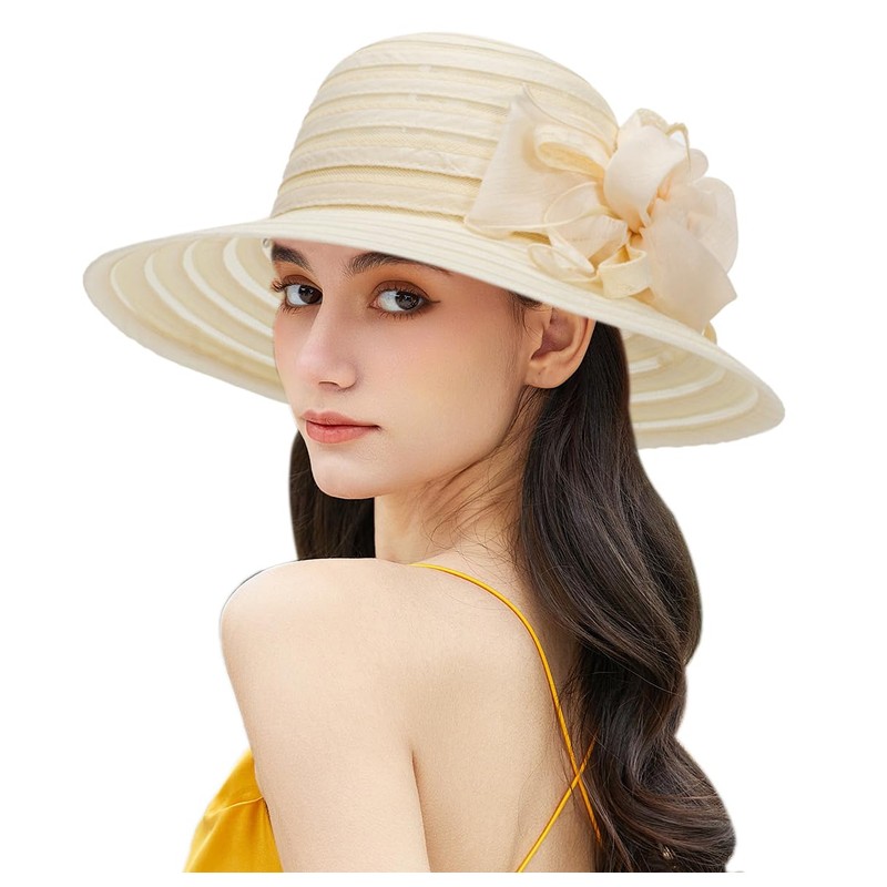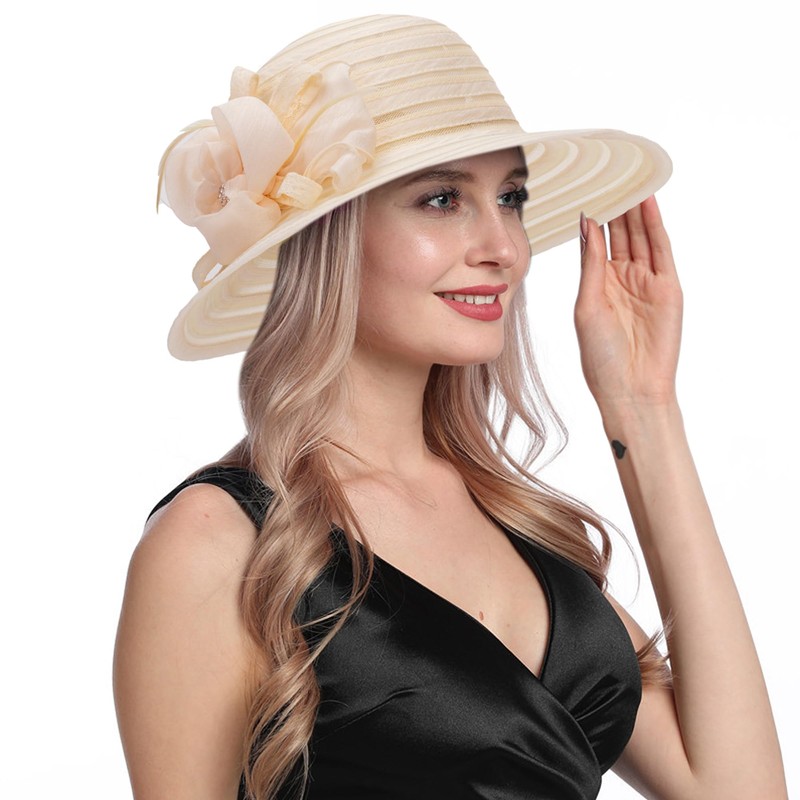 HilyBony Kentucky Wide Brim Hat for Women Organza Derby Hat Bride Wedding Church Tea Party Wide Brim Summer Sun Cap, beige