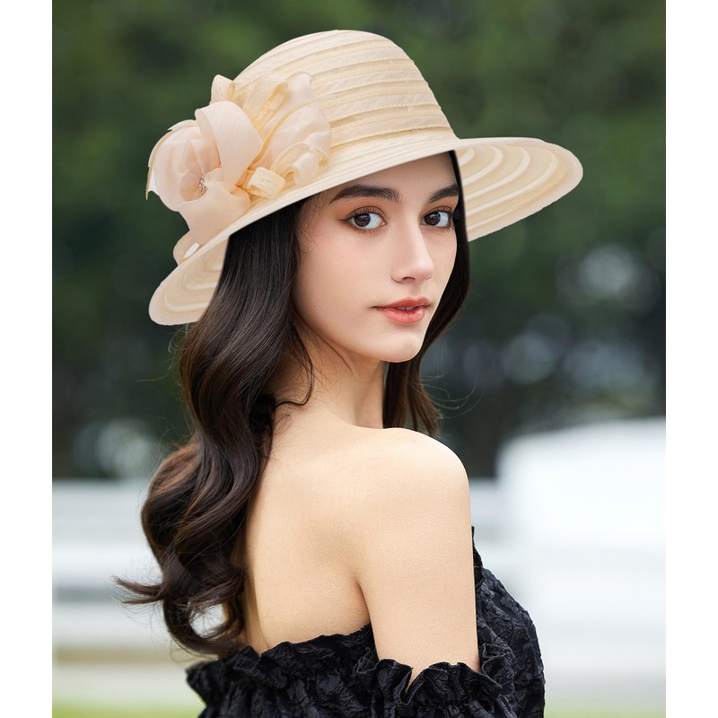 - Organza Beach Sun Hat Size:This fascinator cap for women is suitable for head circumference 56-58cm, wide brim 8.5cm, hat height 11cm. The internal sweatband drawstring can be adjusted to size.