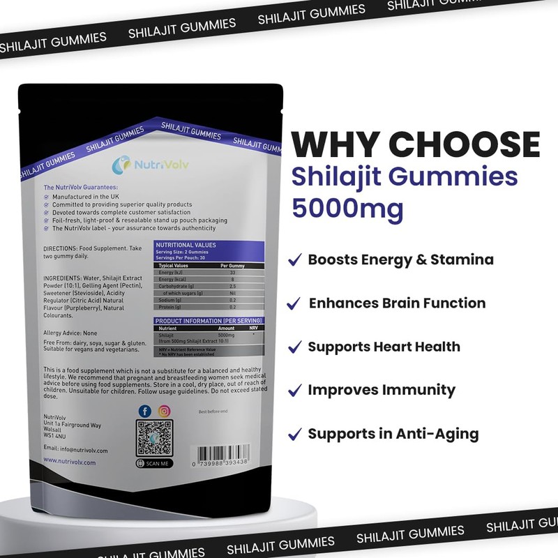 Each serving delivers a potent 5000mg of Himalayan shilajit, making these gummies a powerful choice for those looking for high strength shilajit supplements. Whether youโre searching for shilajit gummies for it's vast benefits or you simply want a flavourful alternative to traditional formats, NutriVolv offers a convenient and enjoyable option. These gummies support those seeking shilajit for energy, performance, or general wellbeing, thanks to the naturally occurring minerals such as fulvic acid found in authentic Himalayan shilajit. With 60 gummies per pack, you have a full monthโs supply at the suggested two-a-day dose, making this supplement an easy addition to your daily wellness routine.