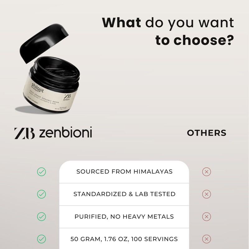 Here are a few tips: Source: Look for Himalayan shilajit (considered the best) or products sourced from other reputable high-altitude regions. Form: Shilajit Resin is considered the most authentic and potent form. While you can also find shilajit in liquid form, capsules, and gummies, shilajit resin is the only original and true form of this supplement. Other forms are more or less processed. The least processed form after resin is capsules, while the most processed (and least potent) are gummies. Third-Party Lab Testing: Reputable brands will provide lab test results. Always seek lab-tested Shilajit (for your safety) as it may naturally contain high amounts of heavy metals. When choosing Zenbioni's Himalayan Shilajit Resin, you will find lab tests in each box, and you can even find them on our product pages. Look for products rich in Fulvic acid, as it is a key component of Shilajit, which enhances the absorption of nutrients and contributes to the overall effectiveness of the supplement. This should also be backed by 3rd party lab tests. Zenbioni's Shilajit Resin is standardized to always deliver 50% fulvic acid in every jar and every batch. Note that fulvic acid amounts can vary greatly in non-standardized products, as Shilajit is a natural substance.