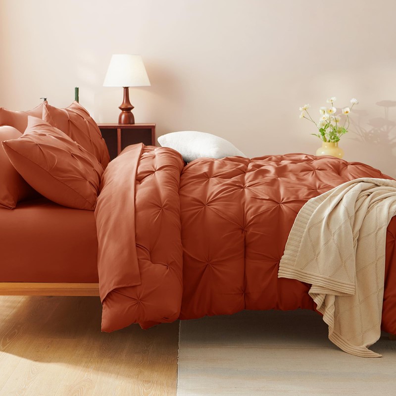 HIMEET Full Comforter Set 7 Pieces Bed in A Bag Burnt Orange Luxury Soft Full Size Bed Set Pintuck Pinch Pleat Bedding Sets with Comforter, Flat Sheet, Fitted Sheet and Pillowcases & Shams
