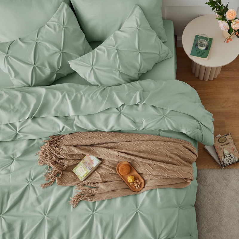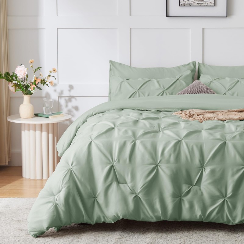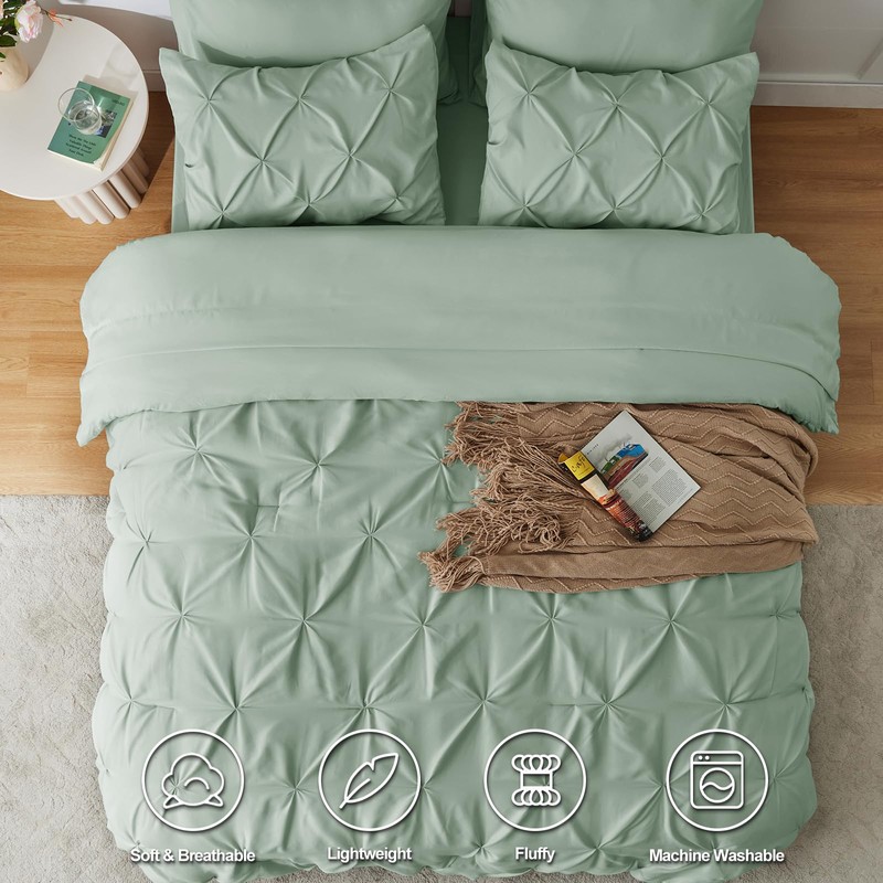 HIMEET- Sage Green King Comforter Set 7 Pieces Sage Comforter (102"x90") Pintuck Design Sage Green Bedding Pinch Pleated Light Green Bed in Bag King Size Complete Bed Set with Sheets,Pillowcases&Shams