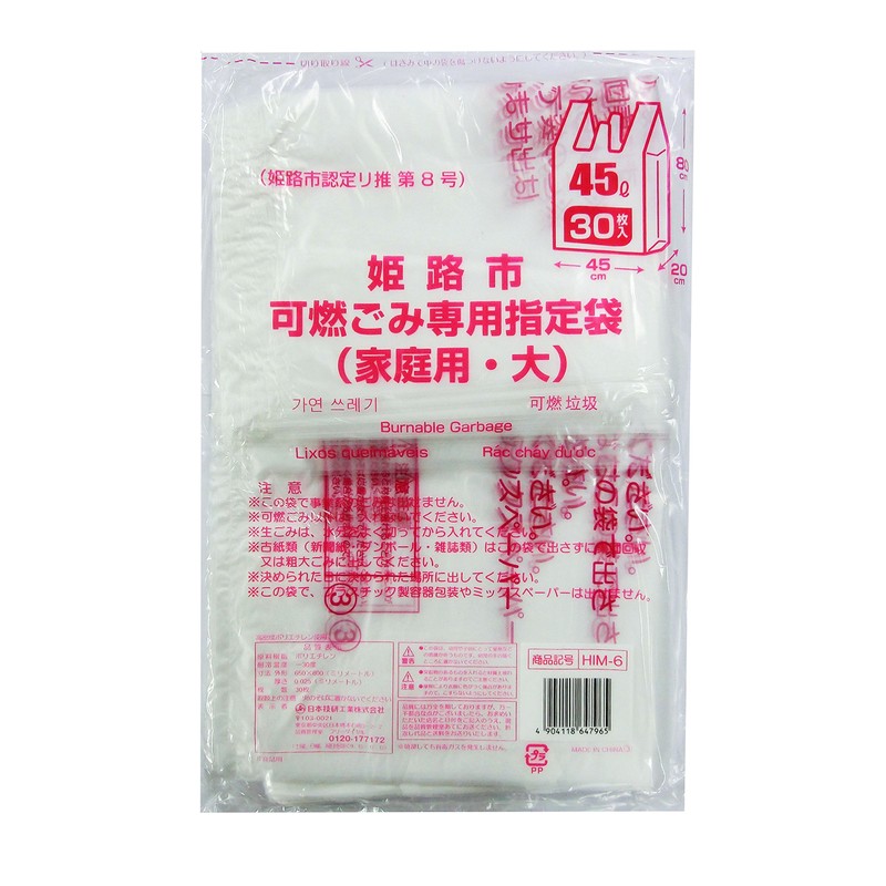 Himeji City Designated Trash Bags for Flammable Garbage with Handle, 1.1 gal (45 L), 30 Sheets