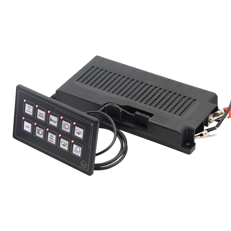 - The switch panel 12 V 24 V, easy installation - no installation depth, minimal drilling of holes, flexible wiring, control relay box at 1 m distance from the touch panel, IP66 - protection against strong water jet (panel only)