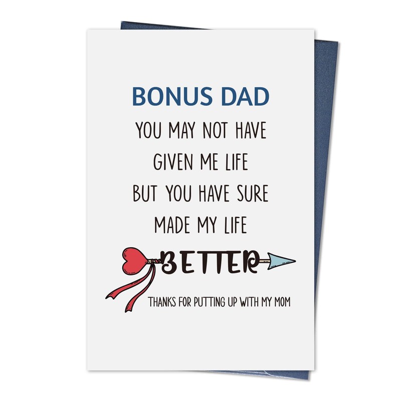 - 💋 FATHER'S DAY GREETING CARD: Give your bonus dad the perfect gift on Father's Day with our 8*5.3 inch greeting card comes with an envelope. Featuring the text "BONUS DAD YOU MAY NOT HAVE GIVEN ME LIFE BUT YOU HAVE SUREMADE MY LIFE BETTER THANKS FOR PUTTING UP WITH MY MOM", this card will surely make them feel special.