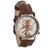 Nickel-free zinc alloy case is 33 mm in diameter. Leather band. 1-year warranty. Japanese quartz movement. Not waterproof.