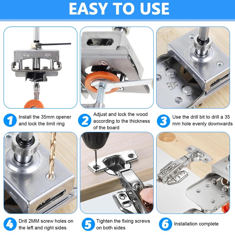 - Wide Application It has a 35mm drill bit for drilling holes. Suitable for most 35mm cabinet hinge jig clamps. It is ideal for everyday installations and repairs of household appliances, such as Cabinets, wardrobes and door locks. With an adjustable opening depth of 10-15 mm and an adjustable drill edge spacing of 3-7 mm.