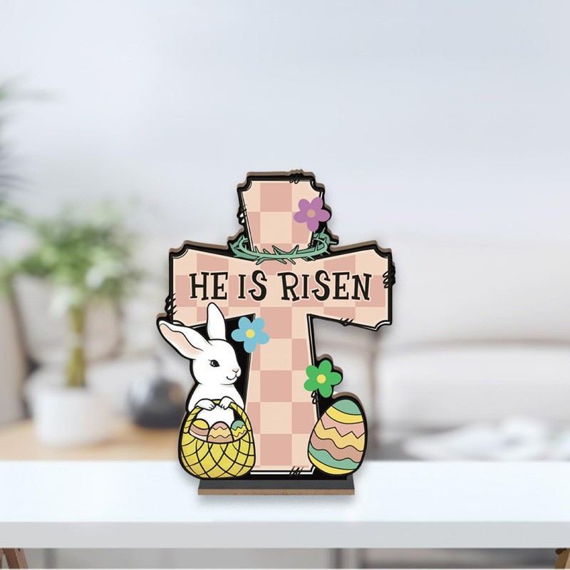 Hinnovy Easter Cross Décor – “He Is Risen” Wooden Tabletop Sign, 9.6x7.4 Inch Religious Bunny Decoration, Easy Assembly for Spring Christian Home