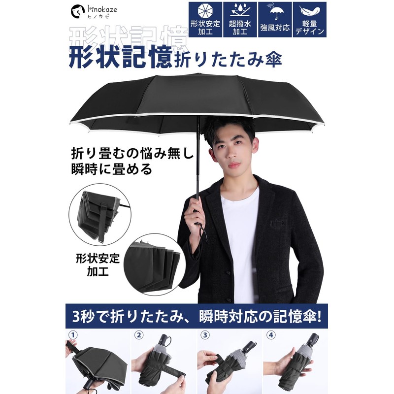 - [Memory Processing Umbrella] This folding umbrella has a shape stabilizing processing that can be folded smoothly in just 3 seconds, so you can store it without stress, even in busy mornings or sudden rainy days. In addition, it does not take up much space in your bag and maintains a smart impression. Typical stabilizing umbrellas may have issues such as weight and peeling when you attach the sheet, but HINOKAZE shape stabilizing umbrellas have been made with a special heat processing technology that creates a crease that is both lightweight and semi-permanent. This makes it easy to fold up and can be easily used by those who have trouble with folding umbrellas