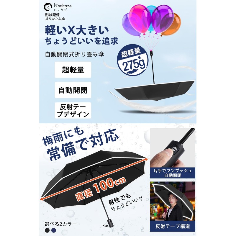 HINOKAZE Men's Folding Umbrella, One-Touch, Automatic Open/Close, Memory Shape, 3 Second Umbrella, 9.1 oz (260 g), Ultra Lightweight, 8 Ribs, Automatic Open/Close, Folding Umbrella, Men's, Women's,
