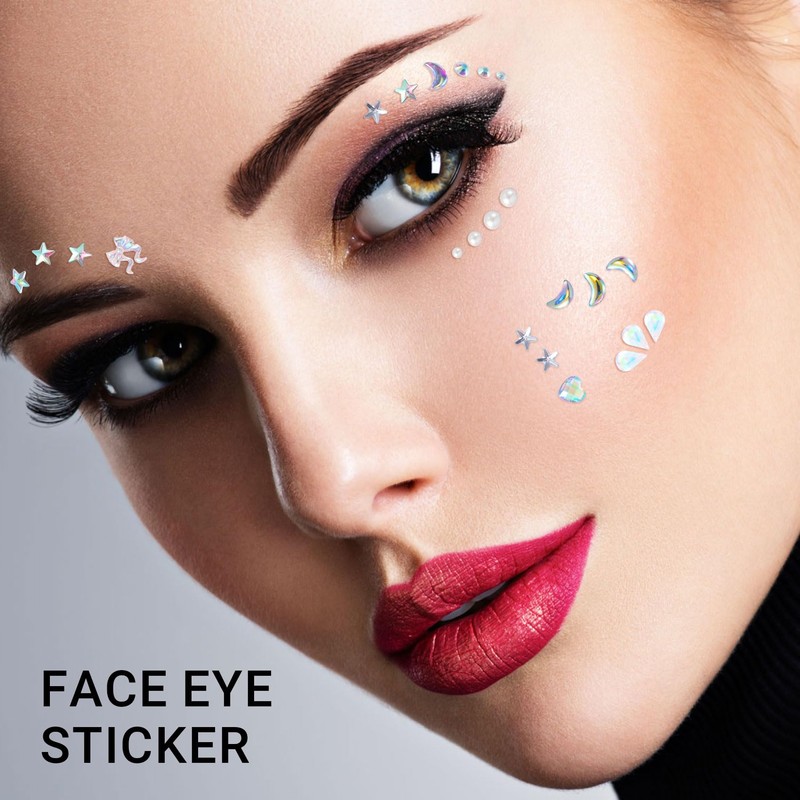 - Package Contains: 4 sheets cute face jewels are in the package, silver color, classic and elegant. The acrylic rhinestones sticker size is from 0.1in to 0.39x0.47in. Enough quantity and sizes choices for your unique rave party makeup needs