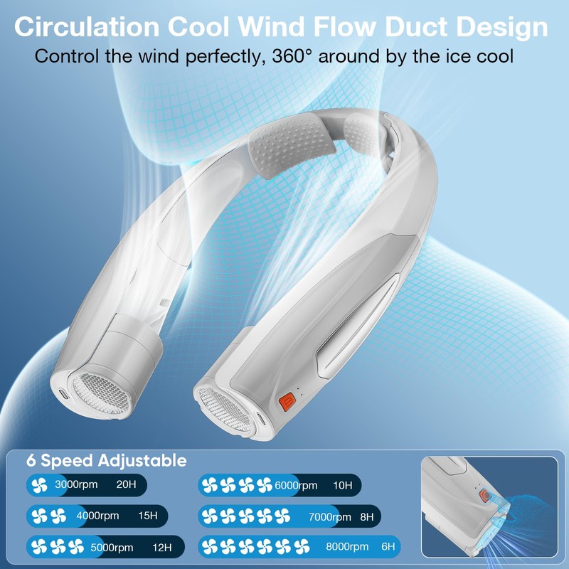 - Advanced AI Neck Fan for Ultimate Cooling – Stay cool effortlessly with our upgraded AI-powered wearable fan. Featuring dual turbine motors, this neck fan delivers 360° airflow around your face and neck. Scientifically designed air outlets ensure a refreshing breeze from all angles, keeping you comfortable even in extreme heat.