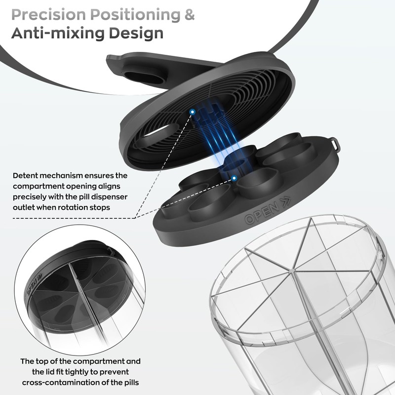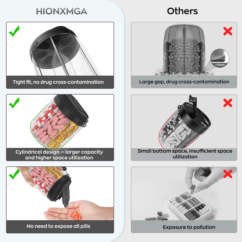 - Anti-mixing design: The minimum gap between the compartments and the upper cover of the pill dispenser is less than 1mm, which effectively prevents the mixing of pills in different compartments. With the Hionxmga pill dispenser, you no longer have to carry multiple medicine bottles, and you don't have to worry about multiple pills mixing together.